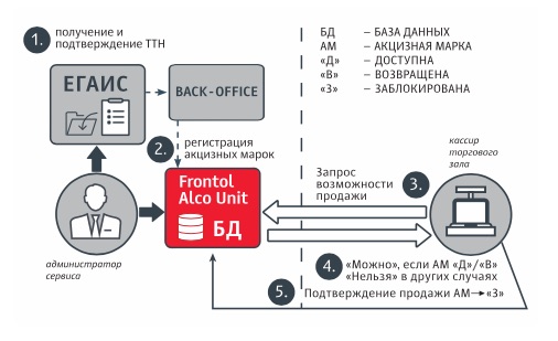 Frontol Alco Unit представляет собой веб-сервис, использующий базу данных SQLite. Сервис ожидает входящих соединений на 8000 порту. Взаимодействие между кассовым программным обеспечением, сервисом и администратором происходит по протоколу HTTP.